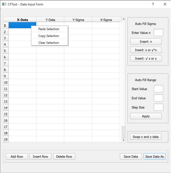 At the top right there is Auto Fill Sigma, where you can either fill either the x or y-sigma column with a constant value for all values (as entered in the text box “n”) or with a value equal to “n” multiplied by the corresponding x or y value. You can also fill with the square root of the corresponding x or y value. To choose which sigma column to fill, simply select any box in the target column (only necessary in four column mode).