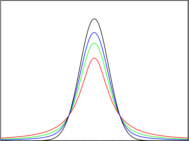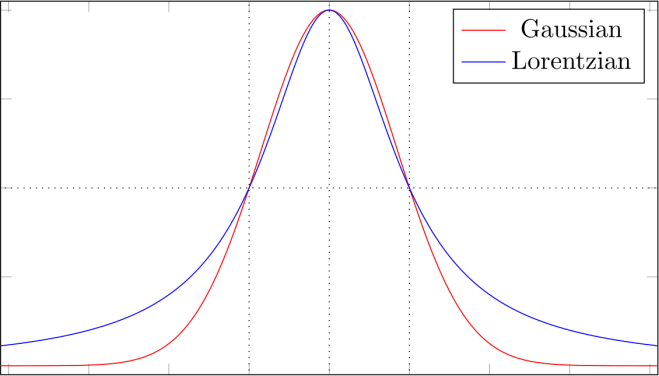 Above we have a comparison of a Gaussian and a Lorentzian profile, scaled to have the same height and width.